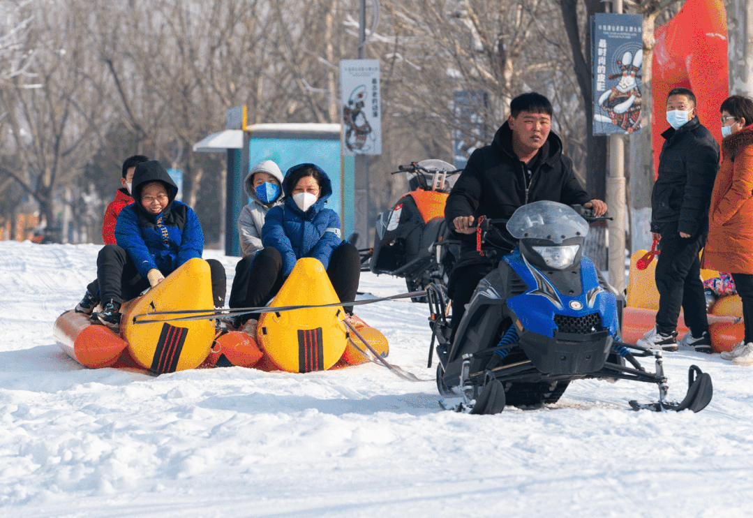风袋花海区:雪地摩托香蕉船 20元/次;雪地坦克 一大一小30元/次;雪地滚筒 20元/次。