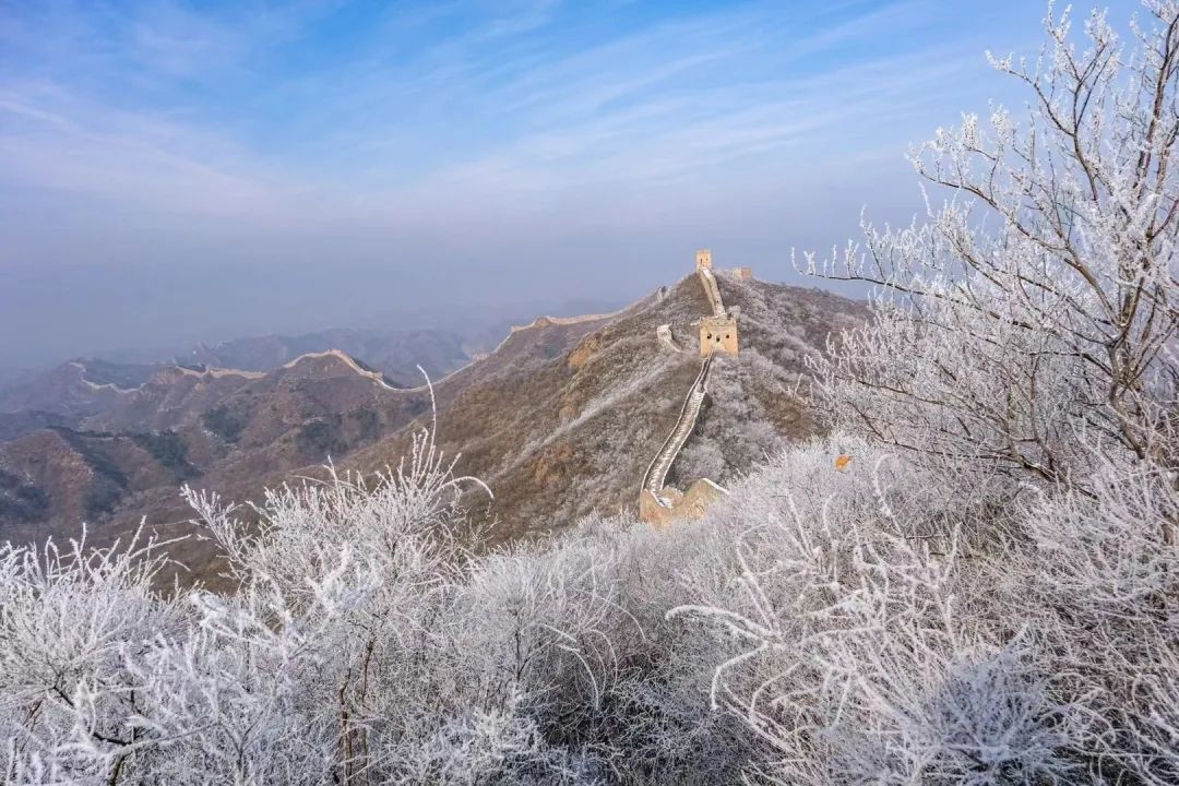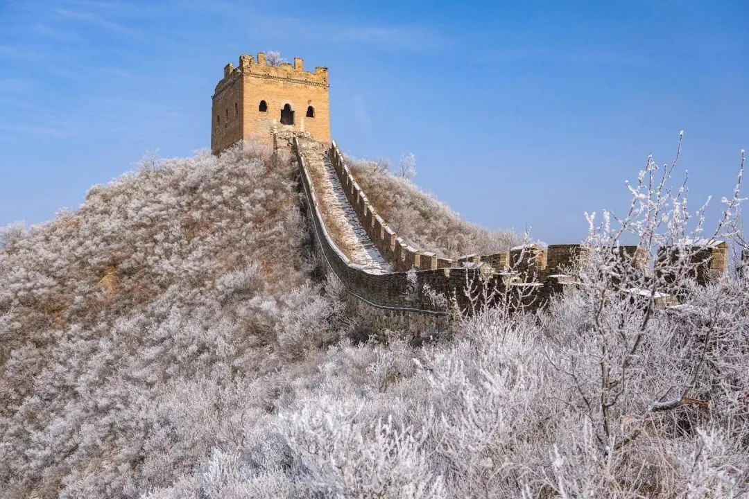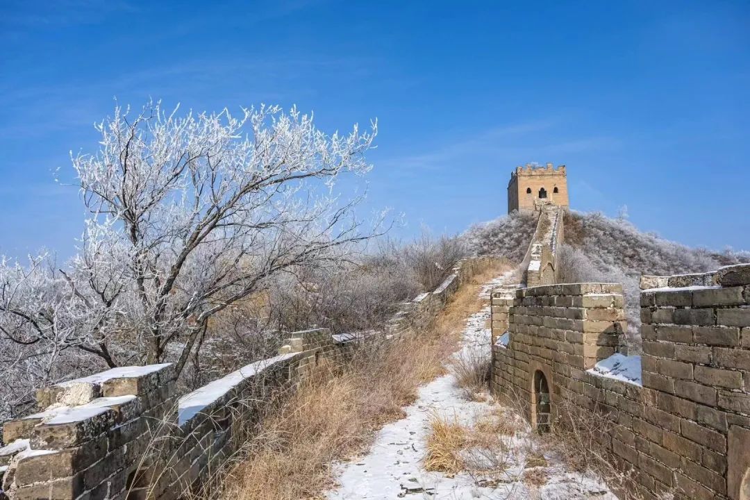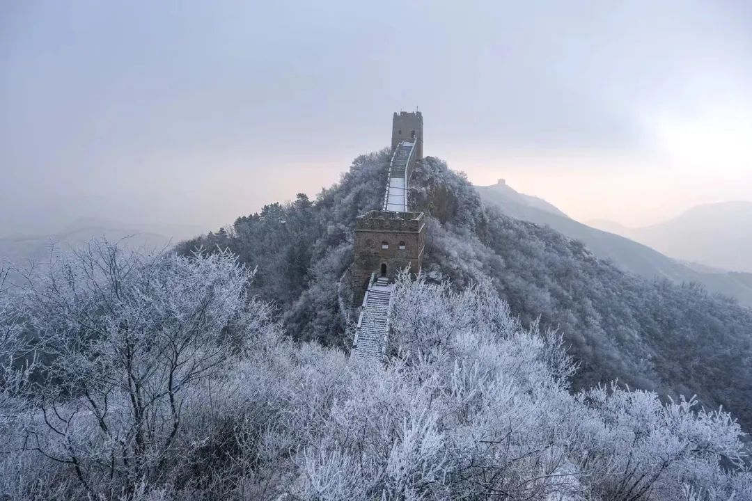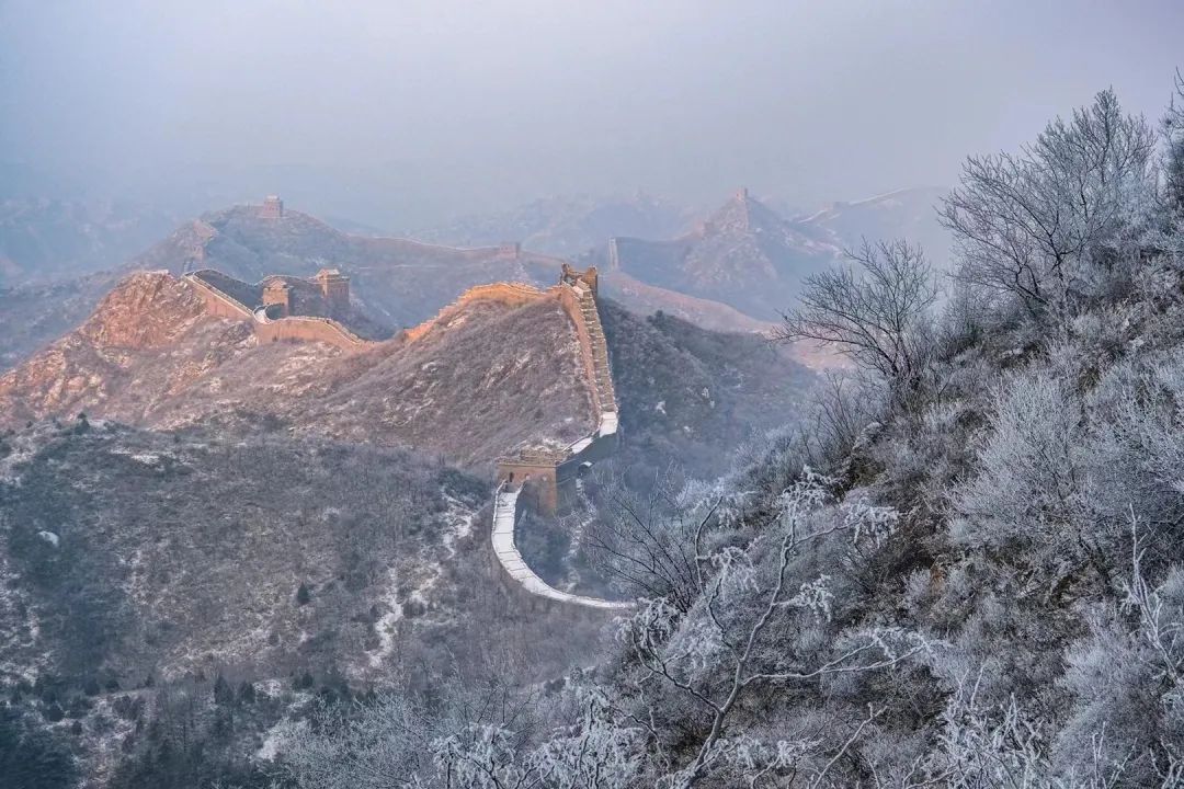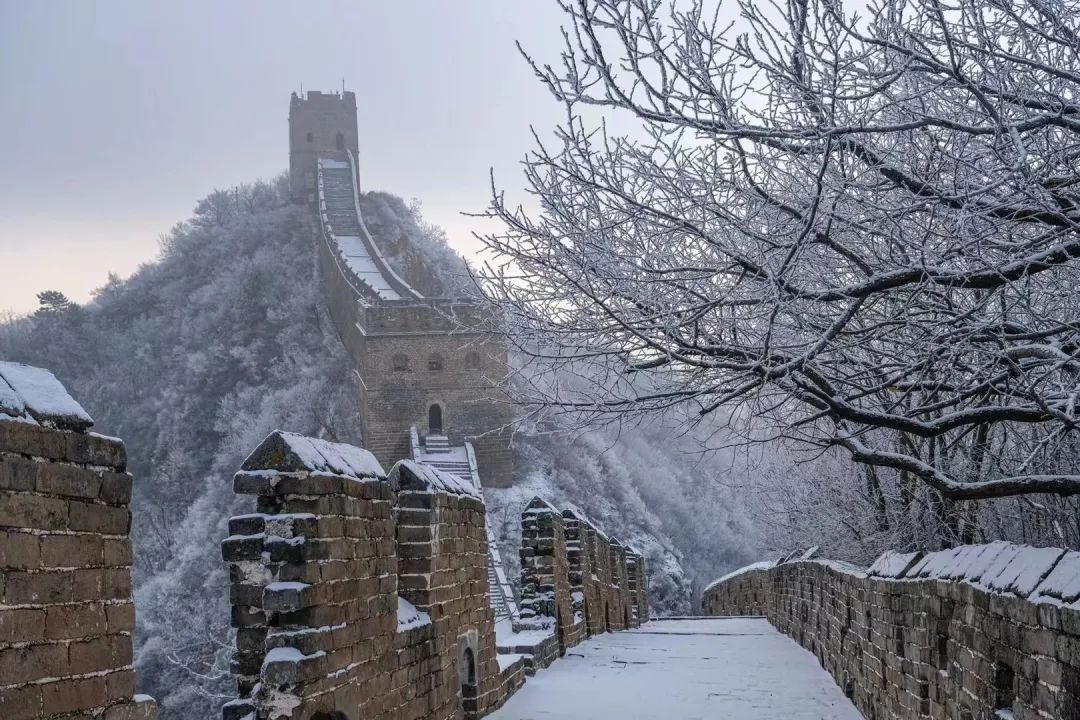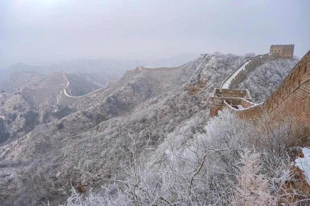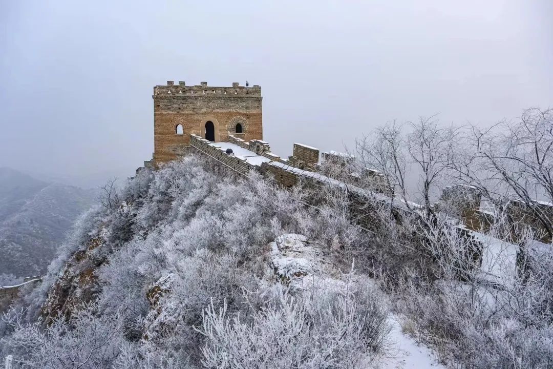 在乍暖还寒的早春时节,金山岭长城被一层春雪覆盖。雪花飘然落下,覆盖了山峦、点缀了树枝,也为长城披上了一层白色的纱幔,古老的长城仿若冰雪王国,静谧壮美,宛如一幅写意水墨画。