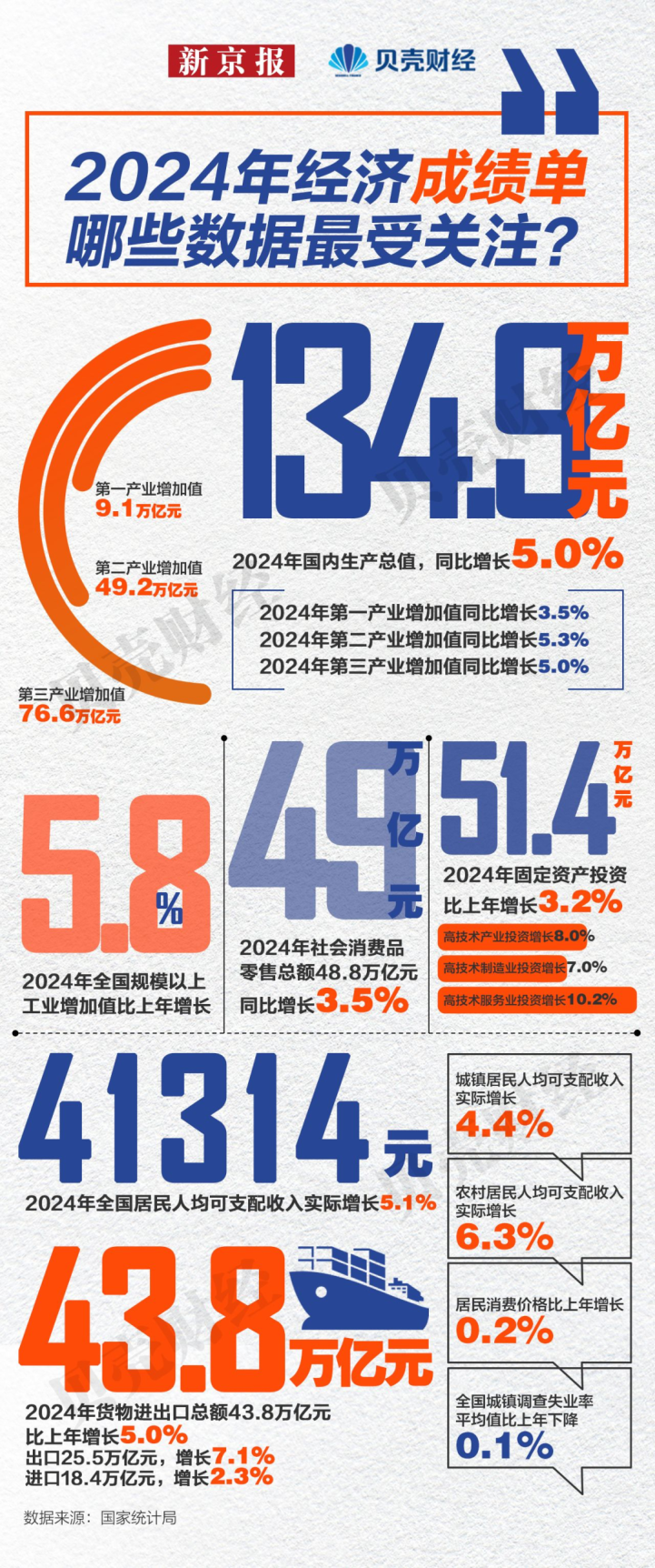 【经济总量首超130万亿元】国家统计局1月17日发布数据显示,初步核算,2024年国内生产总值1349084亿元,按不变价格计算,比上年增长5.0%。这也是我国经济总量首次突破130万亿元,稳居全球第二位。