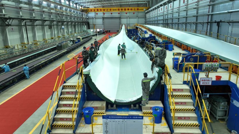 工人在张北艾郎风电科技发展有限公司生产线上工作