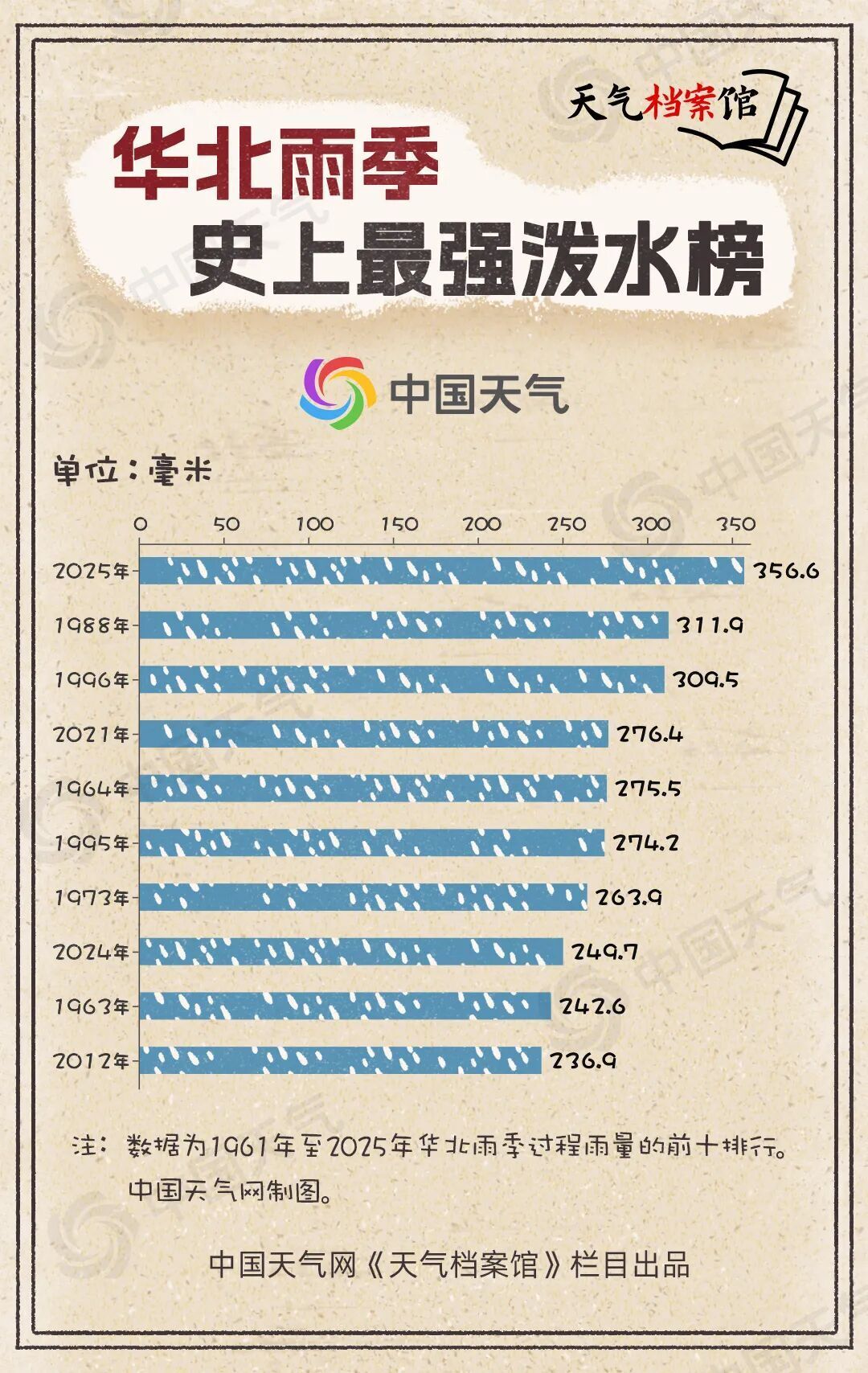 【史上最强华北雨季有多猛】今年华北雨季于7月5日开始,9月2日结束,为1961年以来开启最早、持续时间最长、累计雨量最多。其中,累计雨量达到356.6毫米,是常年平均值的2.6倍。详情>>
