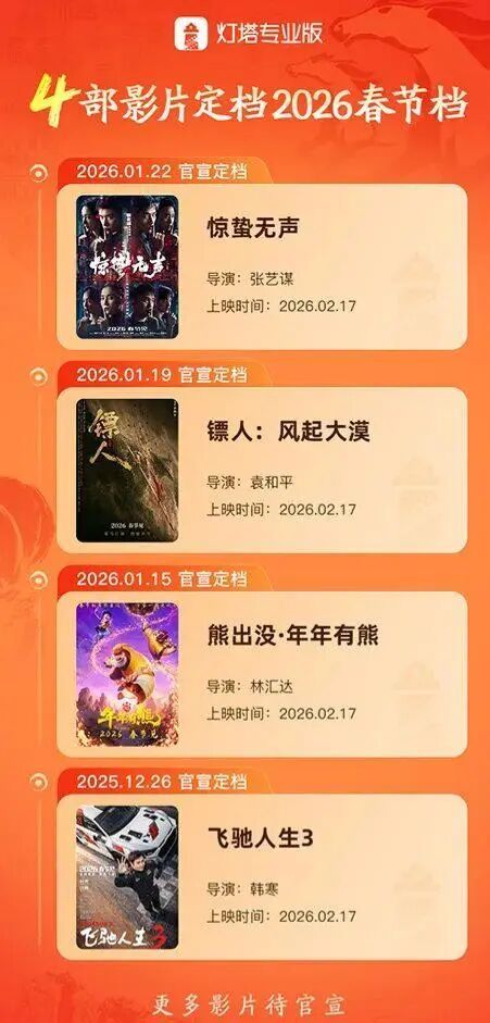 【春节档四部大片定档】2026年春节档长达九天(2月15日至23日),为历年之最。灯塔专业版上映日历显示,目前有四部新片确定于大年初一(2月17日)上映,分别是《惊蛰无声》《镖人:风起大漠》《飞驰人生3》及《熊出没·年年有熊》。影片详情>>