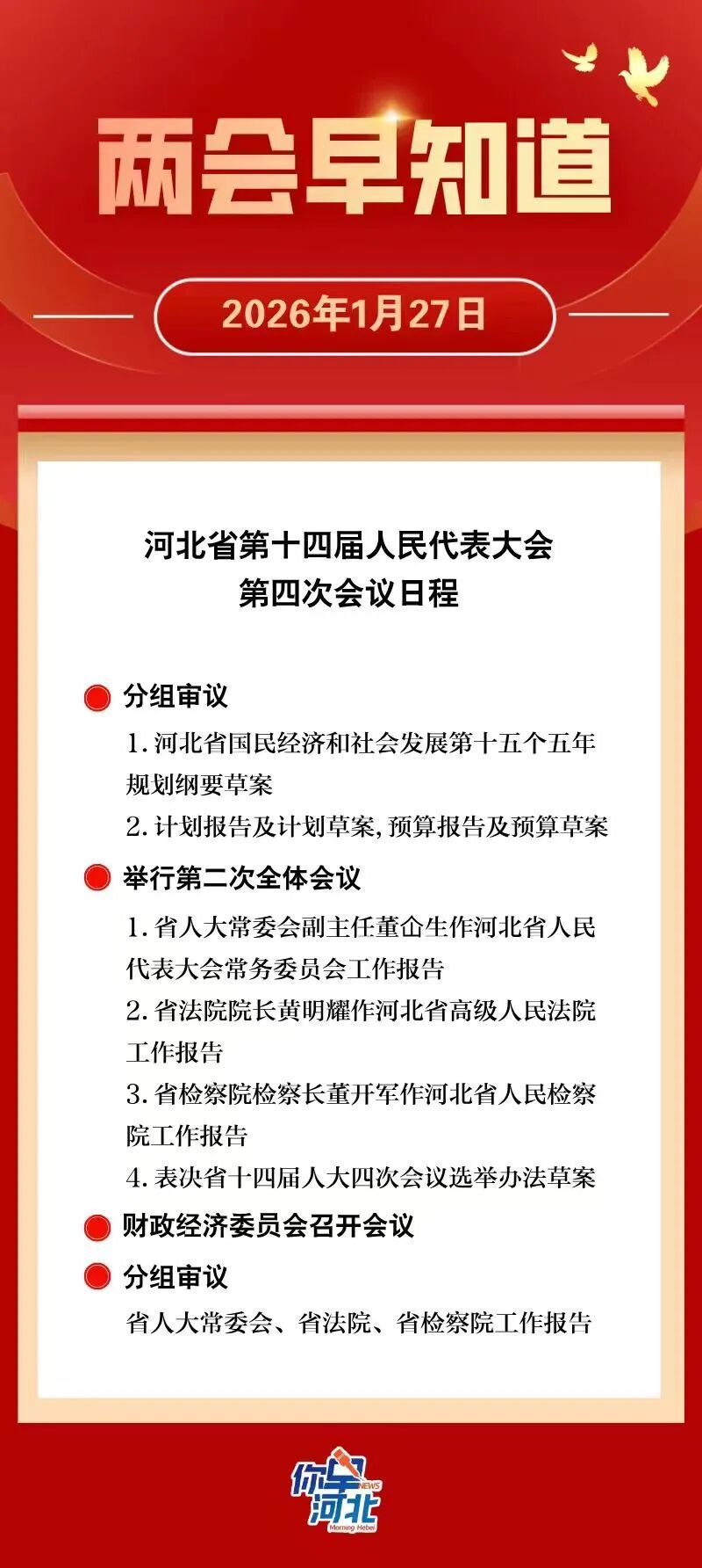 【两会早知道】河北省十四届人大四次会议1月27日日程↓