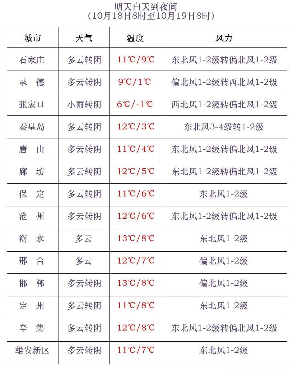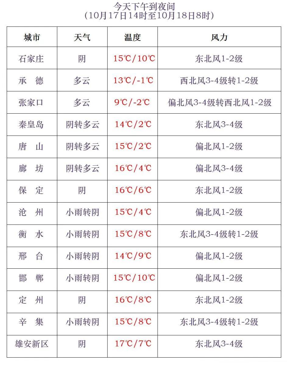 河北省气象台2025年10月17日11时发布天气预报: