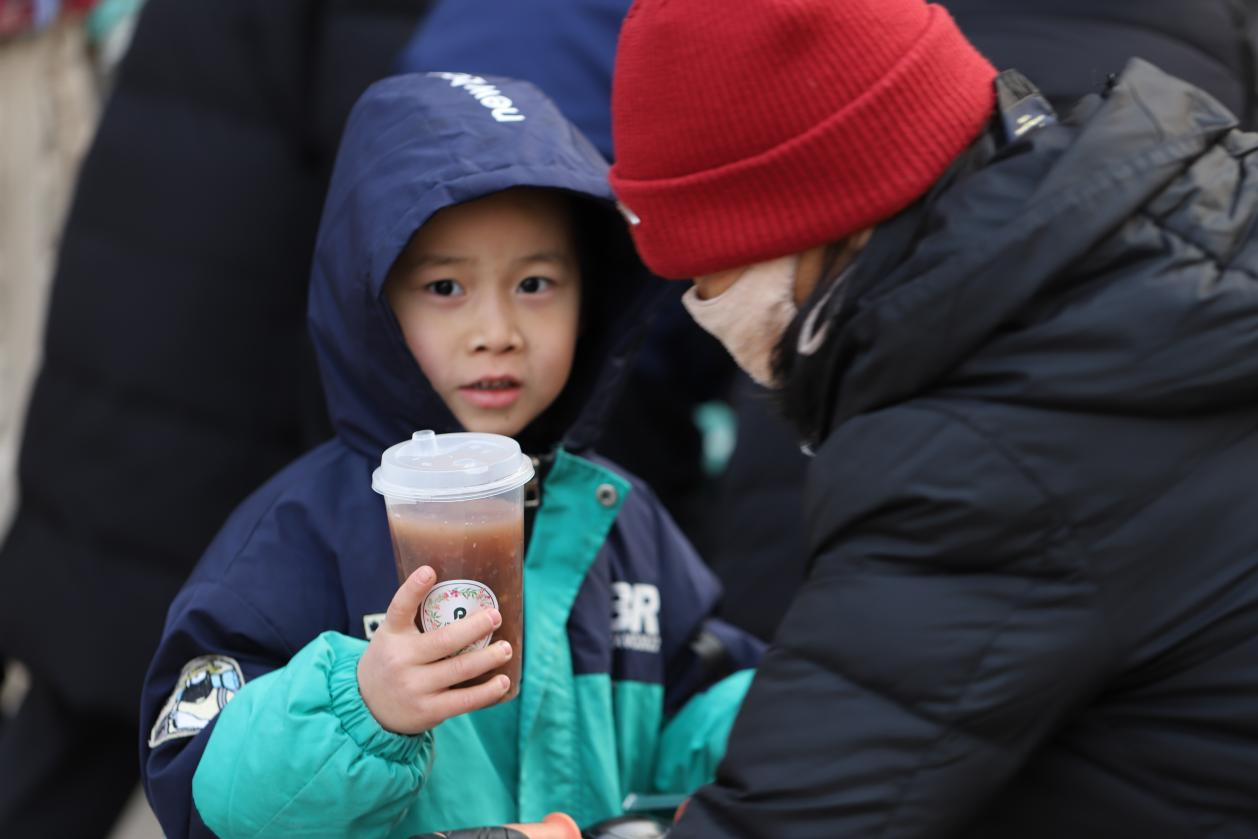 无需自带餐具,物业工作人员早已备好环保纸杯与吸管,大家有序排队领取,老人们细细品尝,孩子们捧着热粥蹦蹦跳跳,脸上洋溢着满足的笑容。