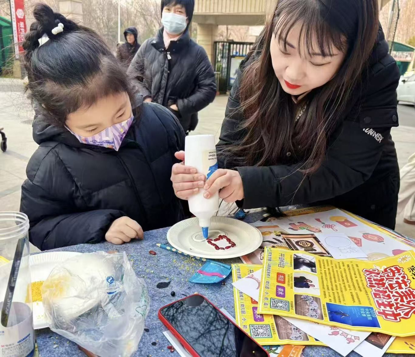 保利书画苑的老师们现场挥毫泼墨,“福”“祥”“腊八安康”“五谷丰登”等寓意美好的字样跃然纸上,笔锋遒劲,墨香四溢。业主们或提笔临摹,感受书法艺术的博大精深;或发挥奇思妙想,用红豆、绿豆、小米、黑米等五谷杂粮,在书法作品周边拼贴出梅花、祥云、小鱼、福袋等吉祥图案——红色的红豆点缀成梅花花瓣,金黄的小米铺成祥云纹路,黑色的黑米勾勒出小鱼轮廓,让传统书法与自然谷物碰撞出独特的艺术火花。