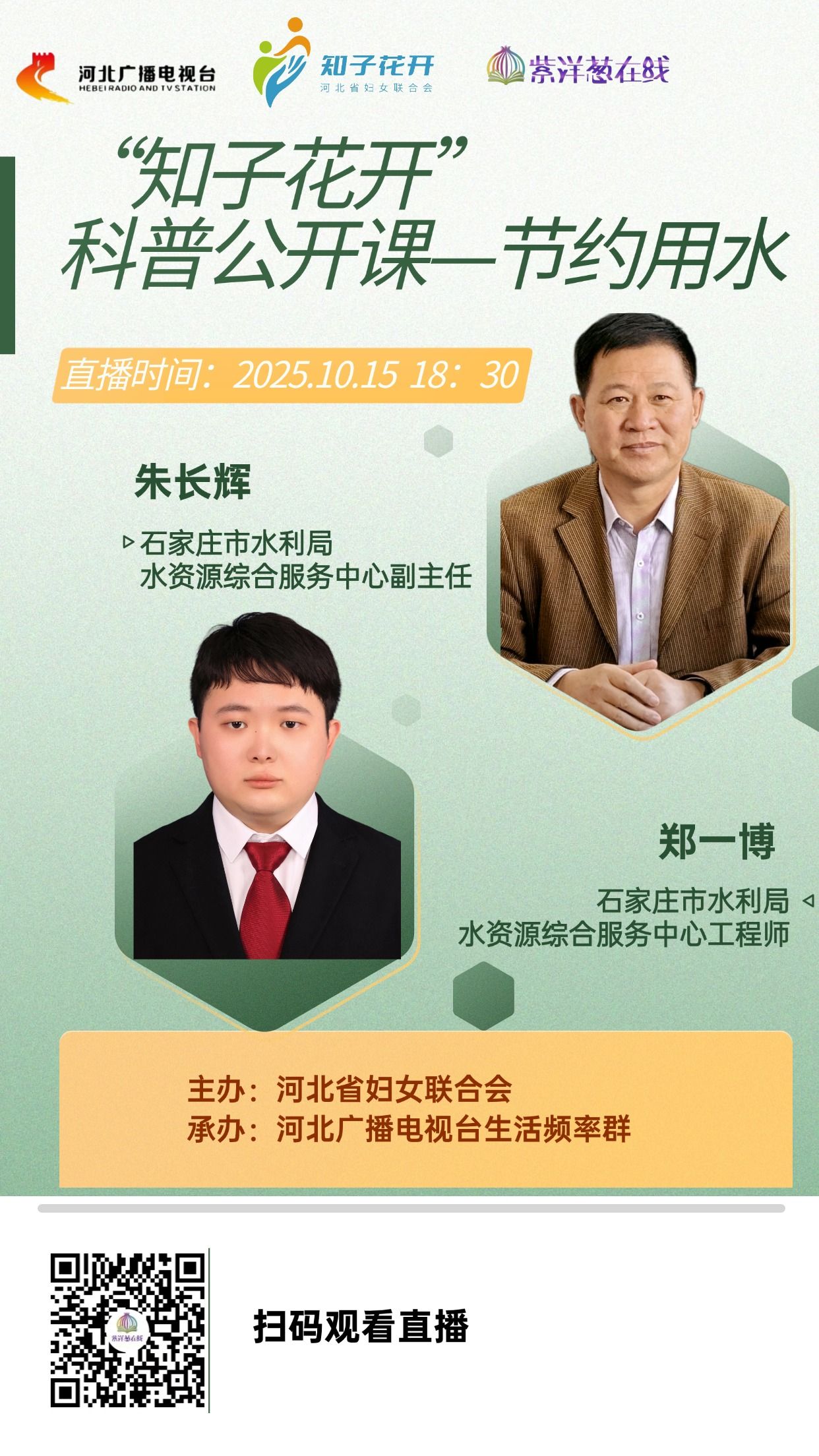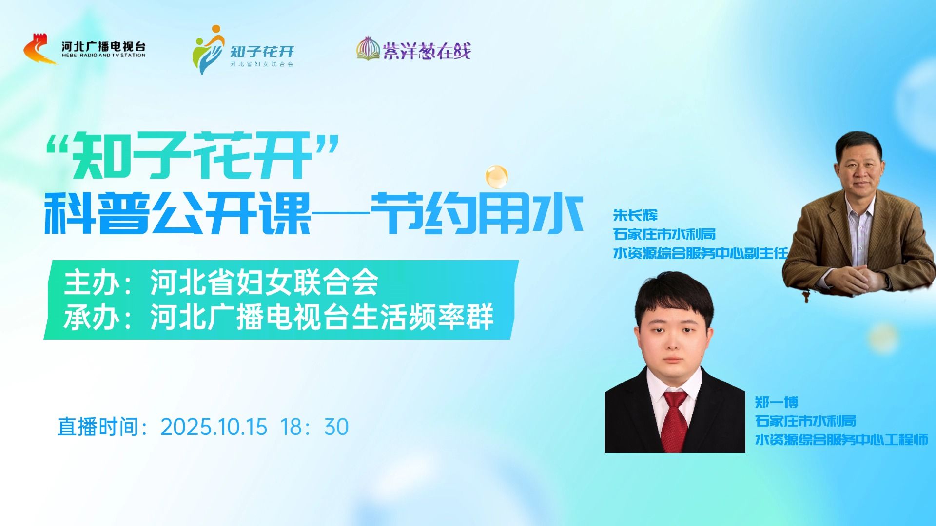 你或许从未在意 —清晨接水时溢满杯口的那几滴水,洗澡时多开的 2 分钟热水,其实都在悄悄 “消耗” 我们的水资源。我国近一半城市缺水,人均水资源量仅为世界平均水平 1/4,这些数字不是 “遥远的新闻”,而是需要我们每个人行动的信号。10月15日下午6点30分由河北省妇女联合会主办,河北广播电视台生活频率群承办的“知子花开”科普公开课——节约用水将邀请石家庄市水利局水资源综合服务中心副主任朱长辉,石家庄市水利局水资源综合服务中心工程师郑一博来为大家讲讲节约用水。届时河北广播电视台冀时客户端、视频号《紫洋葱在线》将会进行同步直播,敬请关注!