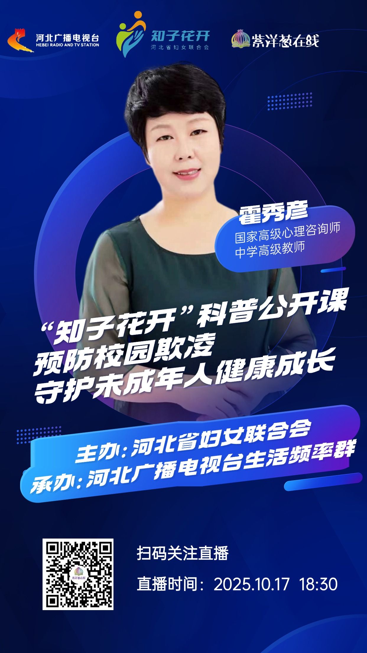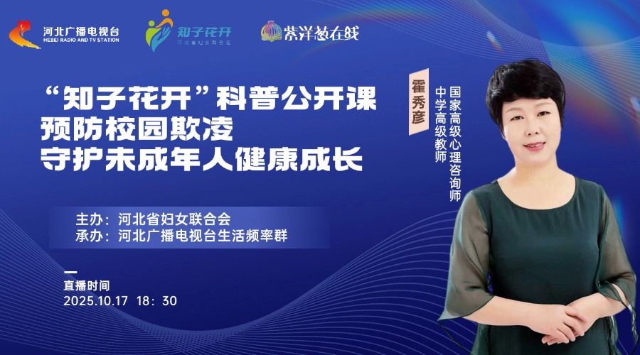 校园是一个集学习、社交与成长于一体的综合性空间。这里不仅是知识的殿堂,更是同学们成长的乐园。然而,近年来校园欺凌事件时有发生,破坏了校园的和谐氛围,影响了同学们正常的学习和生活。为预防校园欺凌发生,进一步增强学生的法治意识和自我保护能力,10月17日18点30分由河北省妇女联合会主办,河北广播电视台生活频率群承办的“知子花开”科普公开课——预防校园欺凌 守护未成年人健康成长将邀请国家高级心理咨询师、中学高级教师霍秀彦来为大家讲讲如何预防校园欺凌,守护孩子身心健康成长。届时河北广播电视台冀时客户端、视频号《紫洋葱在线》将会同步直播,敬请关注!