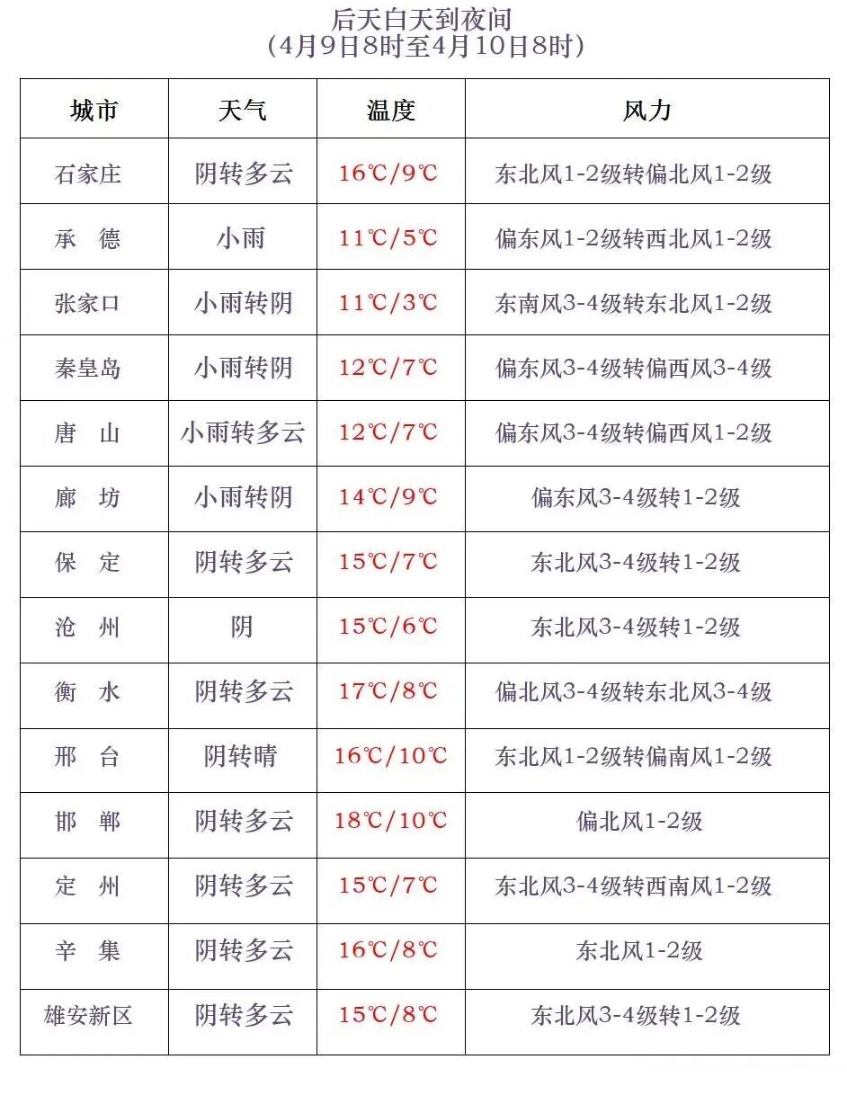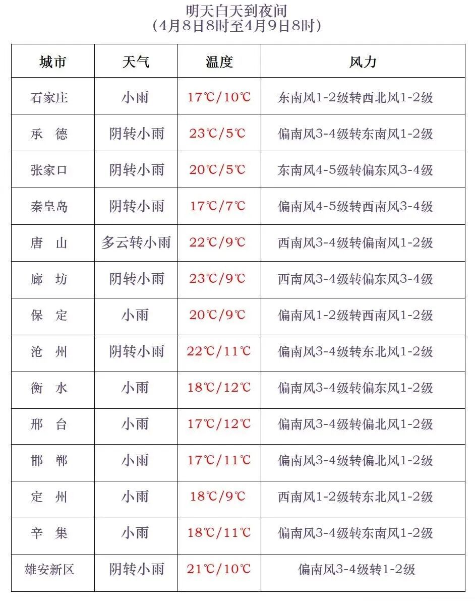 明天白天,全省多云转阴,张家口、承德西部、保定、石家庄、沧州西部、衡水、邢台、邯郸有小雨或零星小雨。