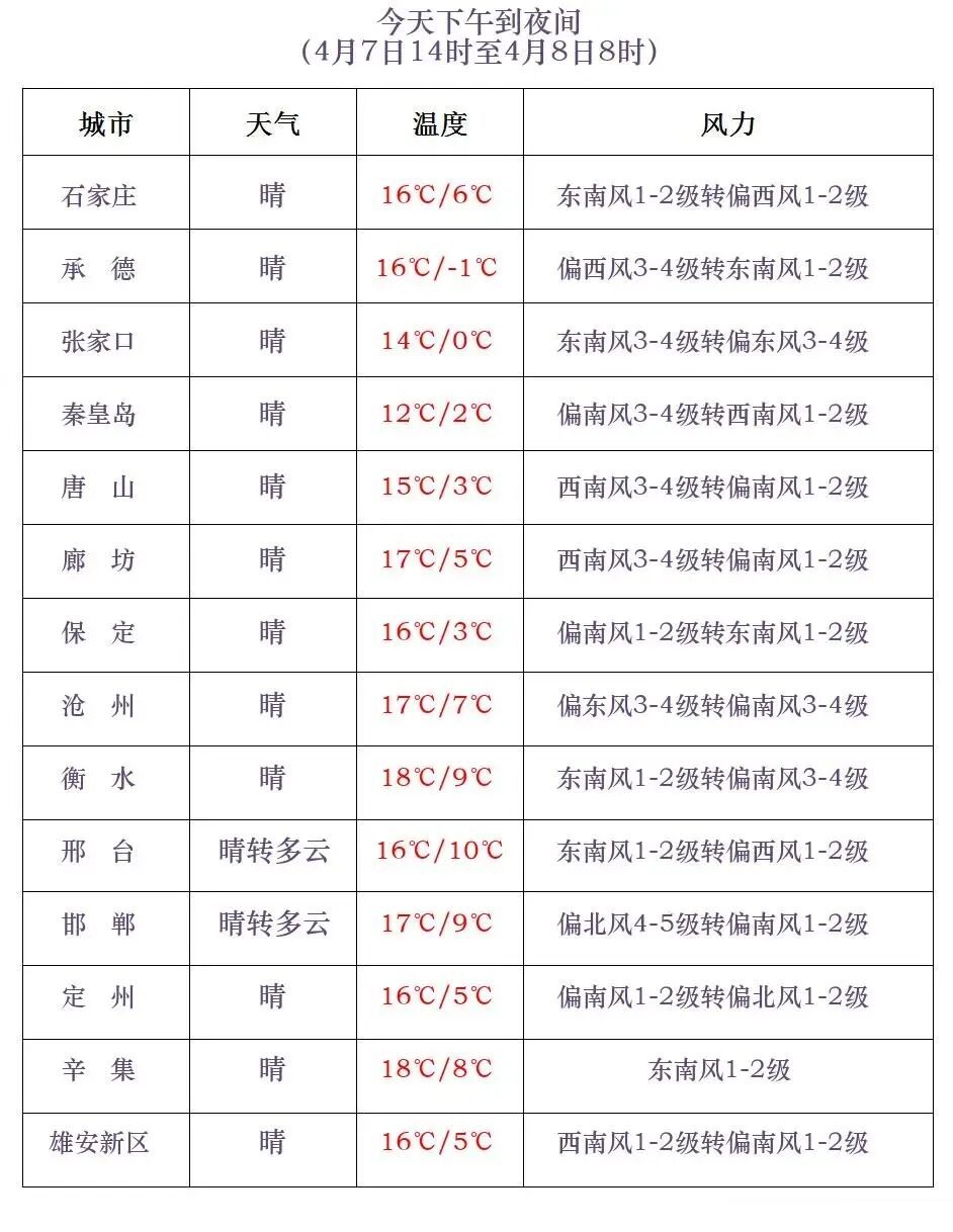 今天下午到夜间,石家庄南部、邢台、邯郸晴转多云,其他地区多云间晴。
