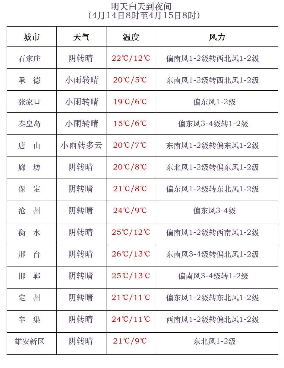明天白天,保定、廊坊以北地区和石家庄、邢台、邯郸三个地区的西部阴有阵雨或雷阵雨转多云,其他地区多云转晴。
