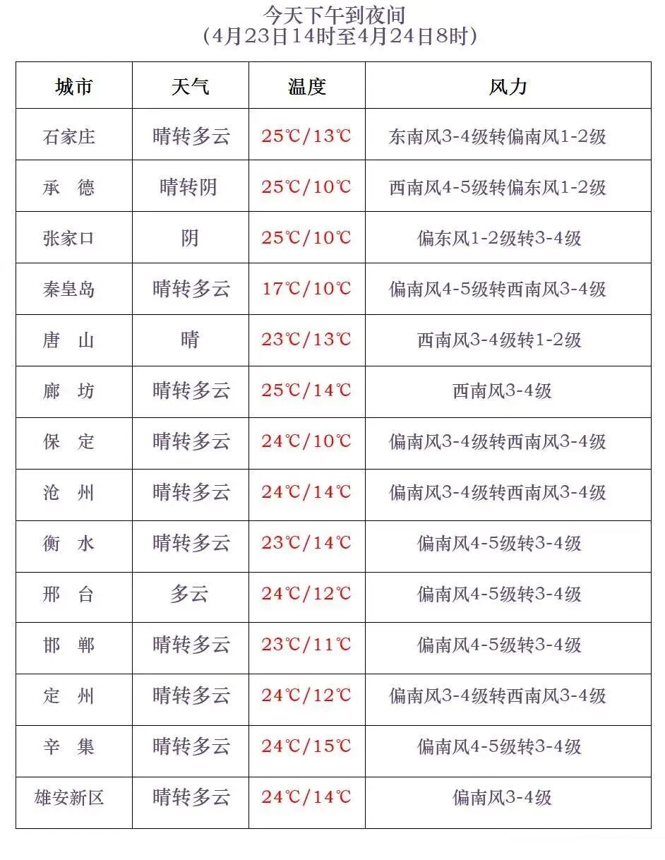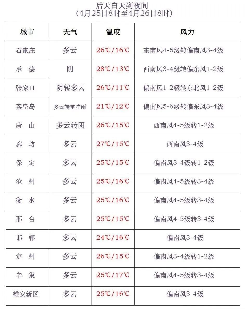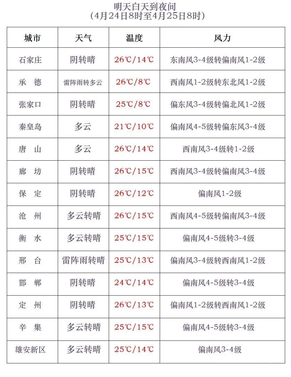 明天白天,张家口南部、承德和保定、石家庄、邢台、邯郸四个地区的西部多云转阴有雷阵雨,雷雨时局地伴有短时大风等强对流天气;其他地区多云间晴。