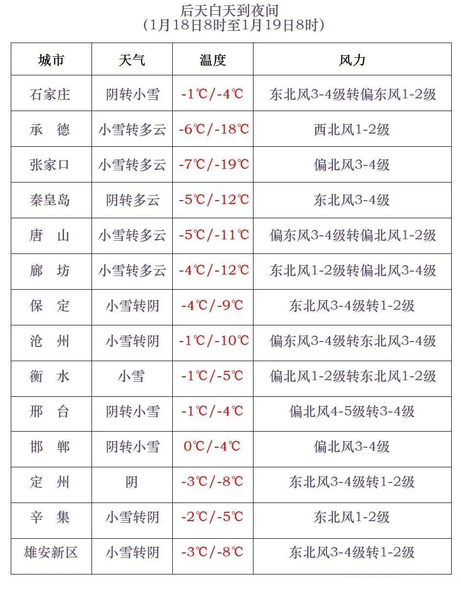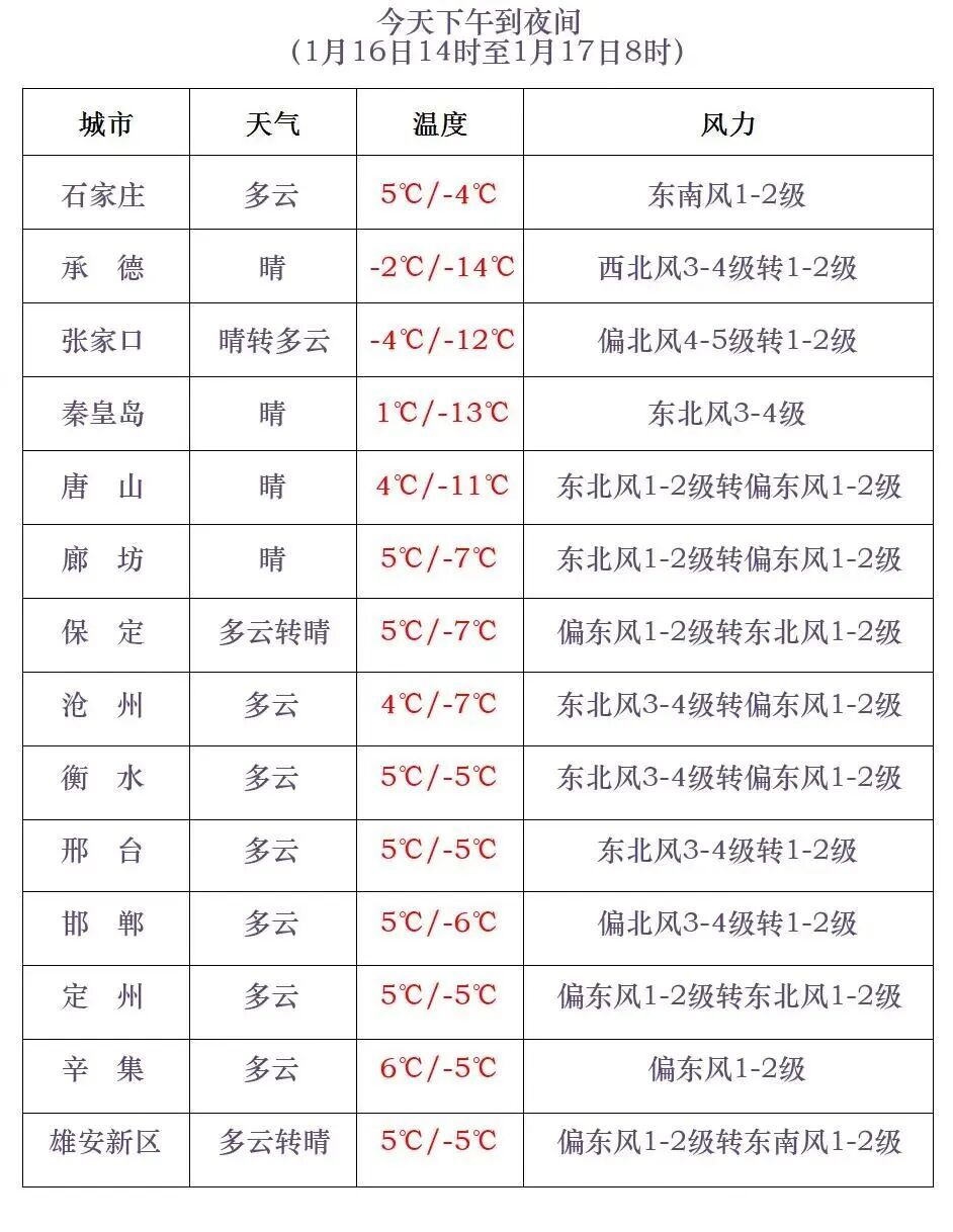 河北省气象台2026年1月16日11时发布大风蓝色预警信号:受蒙古国东移南下冷空气影响,预计今天白天,张家口、承德、保定西北部、沧州东部、衡水东部、邢台、邯郸有偏北风4到5级,阵风6到7级,局地8级。今天白天到夜间,渤海海域和沿海地区有东北风6到7级,阵风8到9级。河北省气象台2026年01月16日11时发布天气预报:今天下午到夜间,坝上地区和保定、廊坊以南地区多云,其他地区晴间多云。最高气温,张家口、承德0~-10℃,其中坝上地区-20~-11℃,其他地区1~7℃。最低气温,张家口、承德、唐山北部、秦皇岛、保定西北部-19~-10℃,其中坝上地区-29~-20℃,其他地区-9~-4℃。明天白天,张家口东南部、承德北部、保定西部和北部、石家庄西部多云转阴有小雪或零星小雪,其他地区多云。明天夜间到18日,全省多云转阴,大部分地区有小雪或零星小雪,其中沧州东部有中雪。18日夜间到19日,南部地区阴有小雪或零星小雪,其他地区阴转多云。明天白天,张家口、承德西部有偏南风4到5级,阵风6到7级;渤海海域和沿海地区有东北风5到6级,阵风7级。18日,渤海海域和沿海地区有东北风6到7级,阵风8级。明天早晨,张家口、承德、秦皇岛北部、邢台南部、邯郸最低气温继续下降3~5℃,局地下降6~8℃。19日早晨,张家口、承德最低气温下降4~6℃,局地8~10℃。