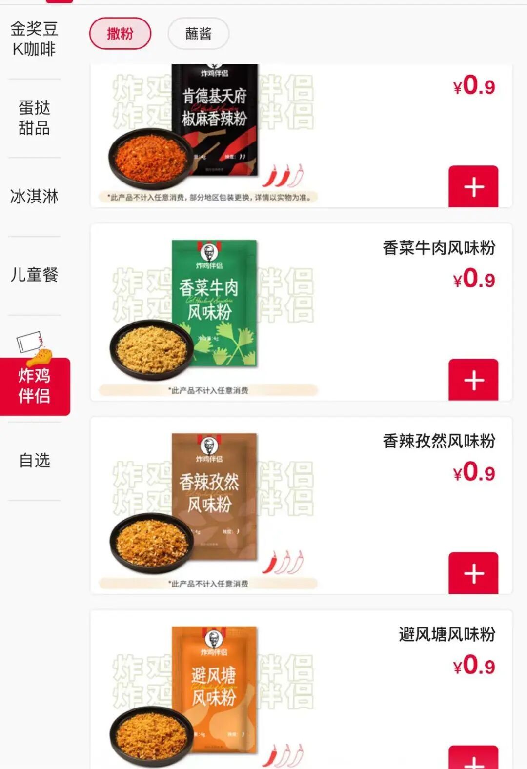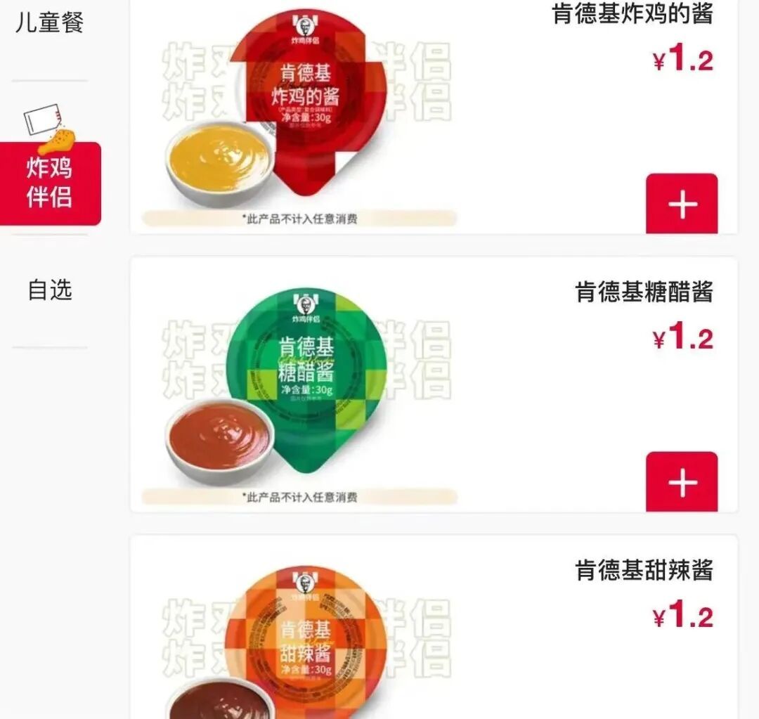 记者查询肯德基点餐小程序发现,目前收费酱料主要包括两类:一类为售价0.9元/包的撒粉产品,如天府椒麻香辣粉、香辣孜然风味粉、避风塘风味粉;另一类为售价1.2元/个的蘸料产品,包括糖醋酱、甜辣酱以及肯德基炸鸡的酱。门店仍保留基础免费搭配标准,例如一份薯条配两包番茄酱、一份黄金鸡块配一盒糖醋酱。超过标准部分,原则上需按规定付费购买。