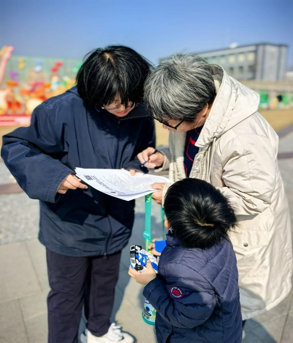有一位奶奶接过问卷,逐字逐句阅读题目,填写时格外认真。她对身旁的同学们说:“这以前是老火车站,我们赶火车、送亲人,都在这儿聚散。现在广场修得这么敞亮,纪念碑、大石桥都保留着,名字里全是石家庄的精气神!”奶奶的字迹工整,还在“建议栏”中郑重写下:“希望这些有故事的站名能被更多人知道,让石家庄的名字响亮起来!”她的话语朴实而深情,让在场的学生深受触动。身边的小孙子一直专注地望着奶奶,听得非常认真,心里也默默记住了解放广场的故事。