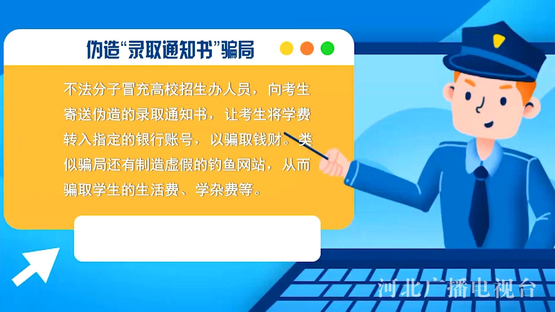 不法分子冒充高校招生办人员,向考生寄送伪造的录取通知书,让考生将学费转入指定的银行账号,以骗取钱财。类似骗局还有制造虚假的钓鱼网站,从而骗取学生的生活费、学杂费等。