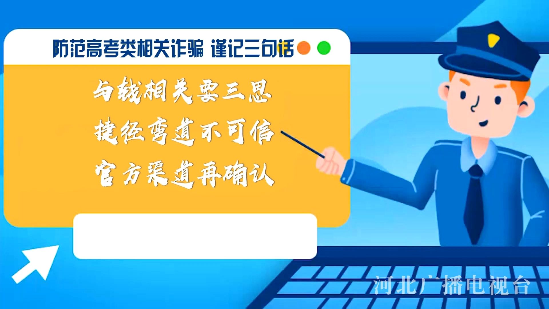 专家提醒,广大考生和家长防范高考类相关诈骗,要谨记三句话:与钱相关要三思、捷径弯道不可信、官方渠道再确认。