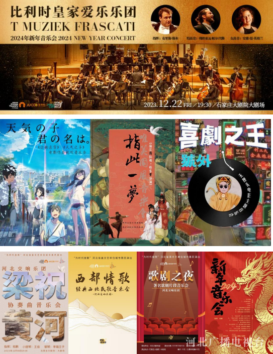 音乐会板块共10台10场演出。12月22日,拥有百年历史,皇室御用的比利时皇家爱乐乐团为大家奏响2024年新年音乐会;12月31日河北交响乐团2024新年音乐会也将首次在石家庄大剧院奏响交响合唱《长城》中的选段,此外河北交响乐团在新年演出季还为大家带来《梁祝》《黄河》协奏曲音乐会、《西部情歌》经典西北民歌音乐会、《歌剧之夜》主题音乐会;河北民族乐团在2月24日,正月十五当天为大家献上元宵节主题音乐会《祥龙·纳瑞》,祝大家喜乐安宁、阖家团圆;回声爱乐交响乐团也带来了三场有创意又新潮的音乐会演出,12月30日《你的名字》《天气之子》电影作品视听音乐会、国潮交响音乐会《指此一梦》专场和无厘头电影音乐会期待与大家见面。