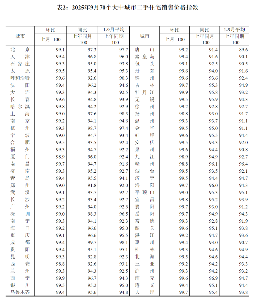 9月份,一线城市二手住宅销售价格环比下降1.0%,降幅与上月相同。其中,北京、上海、广州和深圳分别下降0.9%、1.0%、0.8%和1.0%。二、三线城市二手住宅销售价格环比分别下降0.7%和0.6%,降幅均扩大0.1个百分点。