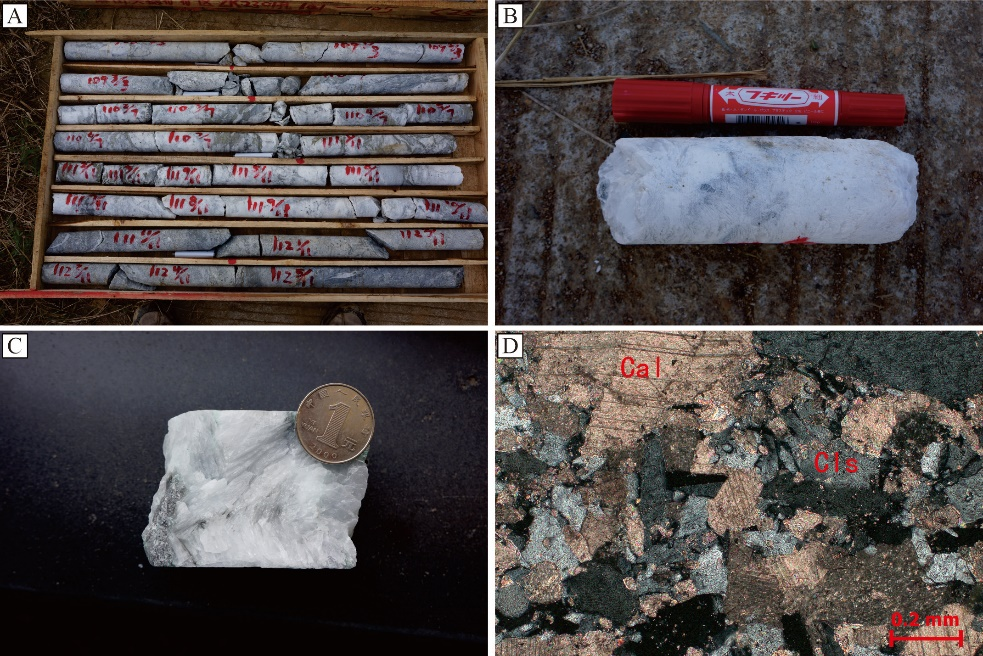 △麻山头锶矿区天青石矿石照片(A,B,C-矿石照片,D-镜下照片,Cal-方解石,Cls-天青石)江苏省地质调查研究院供图