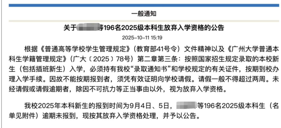 广州大学教务处10月11日就发布公告称,有196名2025级本科生逾期未报到,按其放弃入学资格处理。
