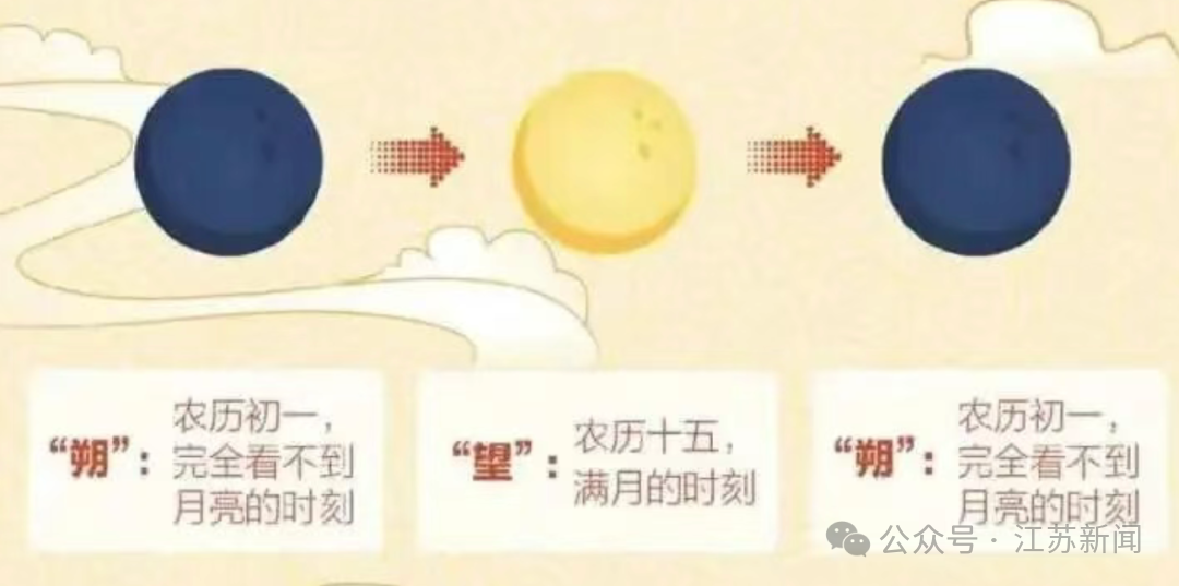 “朔”所在日为初一,是人们完全看不到月亮的时刻;“望”所在日为十五,就是满月的时刻。