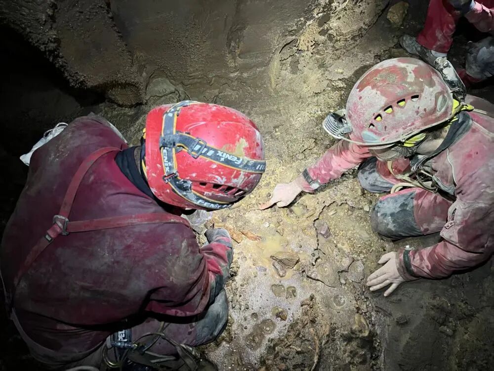 图为研究人员在双河洞洞穴内部查看发现的熊猫化石遗骸。(受访者供图)