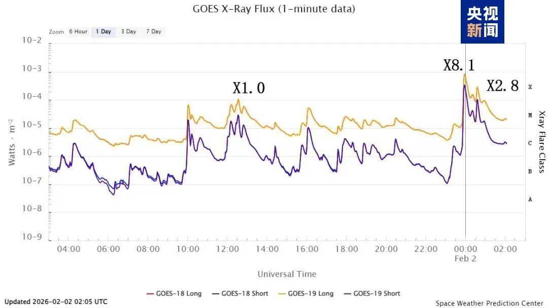 记者从中国气象局国家空间天气监测预警中心了解到,北京时间2月1日20时至2月2日09时,太阳活动区14366连续3次爆发X级耀斑,其中,今早08时左右爆发的耀斑达到X8.1级,是今年太阳出现的最强耀斑过程,同时也是2024年10月以来最强耀斑过程。