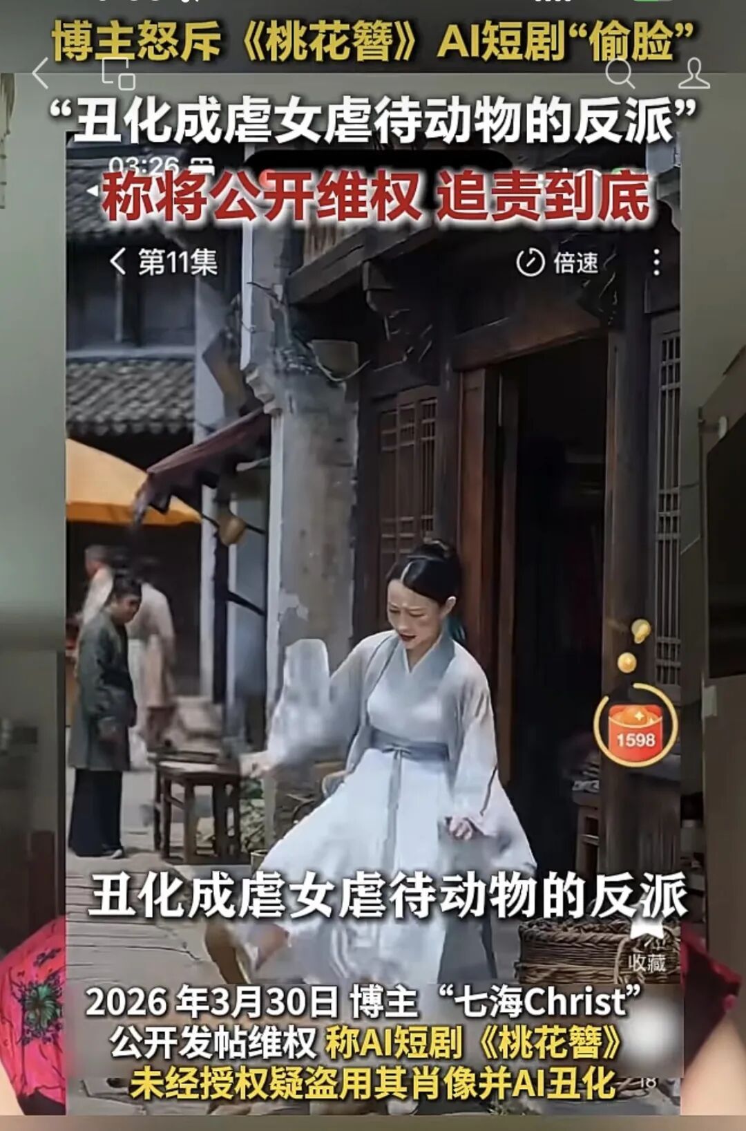 同一天,AI短剧《桃花簪》再度被指盗脸侵权,一模特“七海”发帖称该剧盗用面部形象且剧中角色带有侮辱丑化色彩。“七海”认为,作为商业模特,个人脸部形象是其核心职业资产和商业价值的载体,该短剧在未获授权情况下擅自盗用创作对个人造成极大影响。