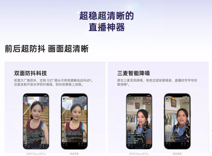 但如果你经常用手机直播,那么优先选择Pro。Reno15 Pro 的定位是“为直播而生的手机”,在收音降噪、防抖以及长时间直播容易出现的卡顿、发热等方面做的更好。