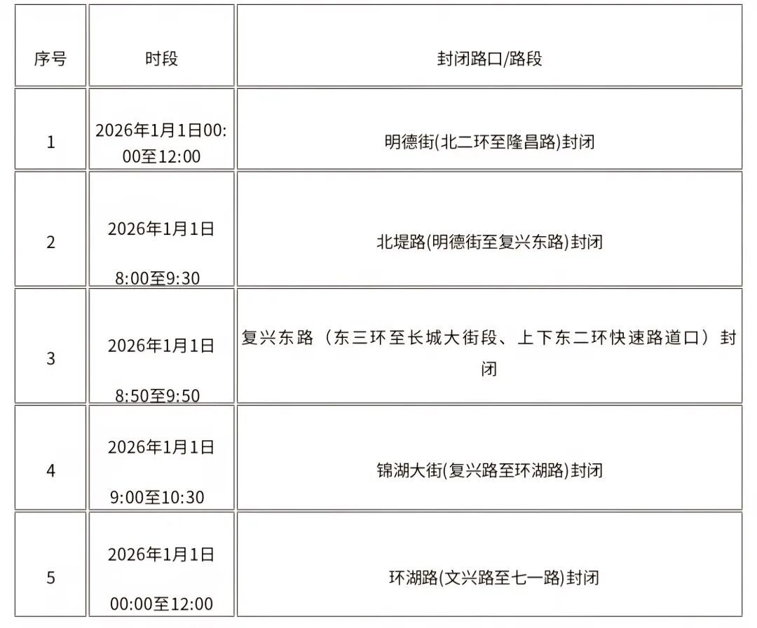 1、12月31日12:00至1月1日12:00迎新年欢乐跑赛道搭建施工,实施临时交通管制。具体路段包括:明德街(北二环至隆昌路)全幅封闭。