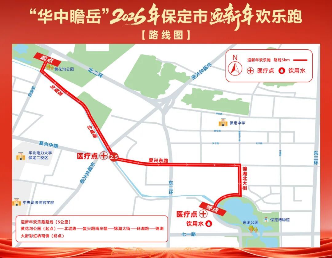 2026年保定市迎新年欢乐跑活动将于2026年1月1日(星期四)在保定市举行。迎新年欢乐跑,活动起点设在明德街黄花沟公园西门口,欢乐跑终点设在环湖路彩虹桥南侧,活动于9:00开始,预计10:30结束。为保障活动安全顺利进行,依据《中华人民共和国道路交通安全法》有关规定,将对活动涉及道路分时、分段采取临时交通管制措施。现将有关事项通告如下: