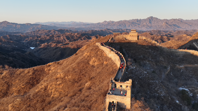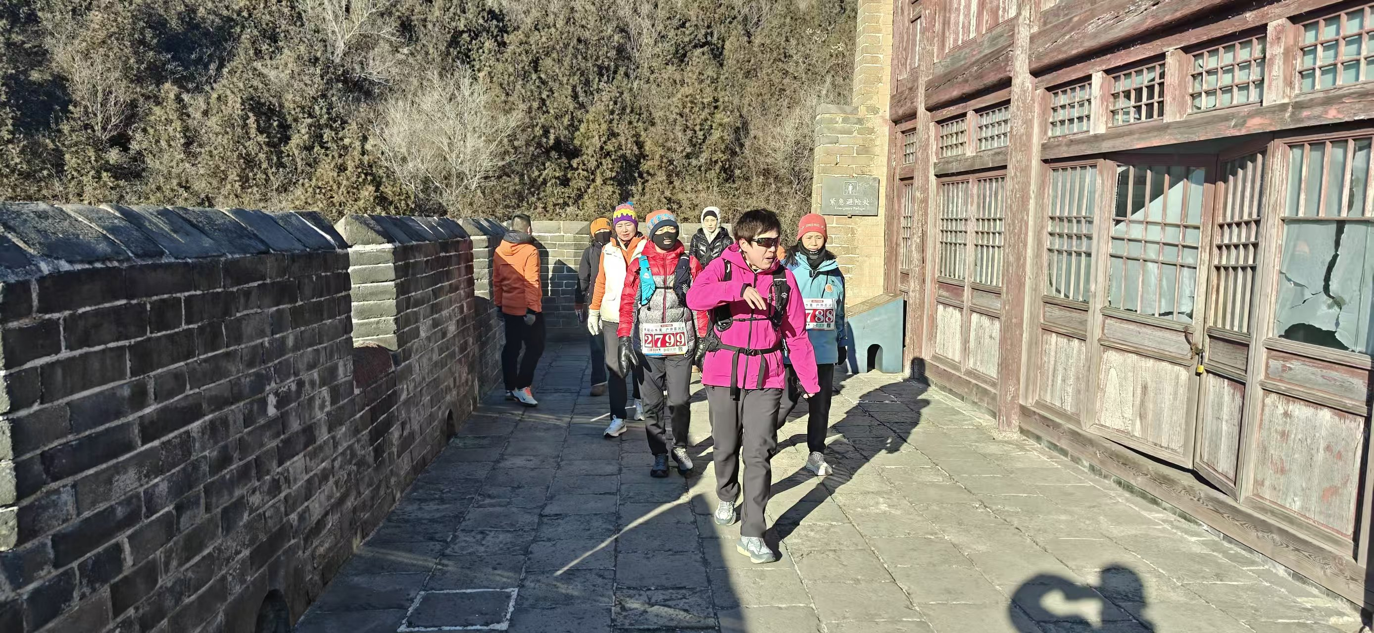 “3、2、1——出发!”上午10时,登山队伍沿着蜿蜒起伏的长城分批有序前行。五颜六色的运动服在新年晨光中格外耀眼,与斑驳古老的城墙交相辉映,构成一道流动的风景线