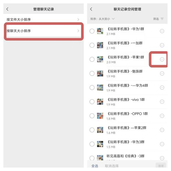 这时候会出现“按文件大小排序”和“按聊天大小排序”,咱们要点击”按聊天大小排序”,这样所有跟你有过消息往来的好友或者微信群便会出现在该页面。你要查看的文件来自哪位好友或者群聊,点击对应聊天框后方的“...”即可。
