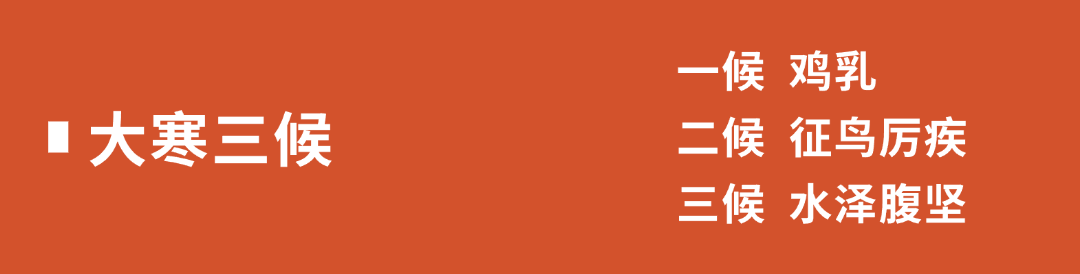 时值大寒节气的最后五天,水域中的冰一直冻到水中央,冰面变得厚实而坚固。这既表现了大寒时节极寒的天气特点,同时也预示着春天即将到来的物极必反、坚冰深处春水生的自然规律。