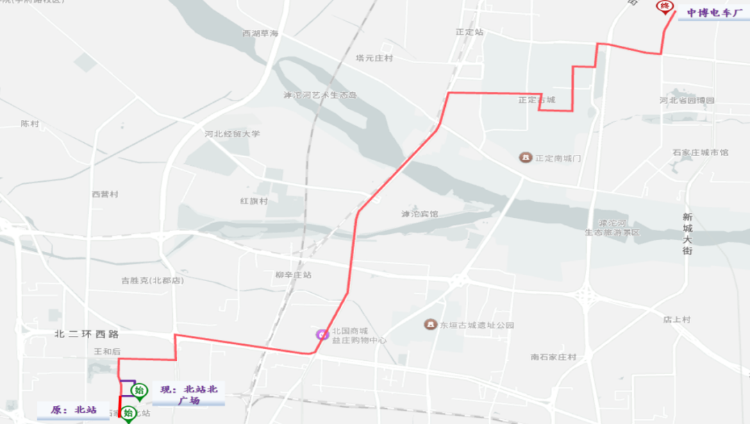 3. 调后路径:园博园大街、晨光路、尉陀街、正无路、城东街、恒山路、旺泉南街、中山路、镇州街、常山路、107国道、北二环、中华北大街、联盟西路、泰华街、滨华路、文苑街、北城路、泰华街返回。