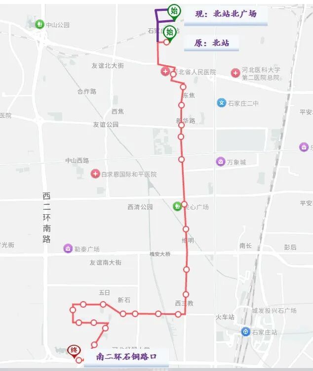 1. 起止点:始发站南二环石铜路口不变,终点站由北站南广场调整为北站北广场。