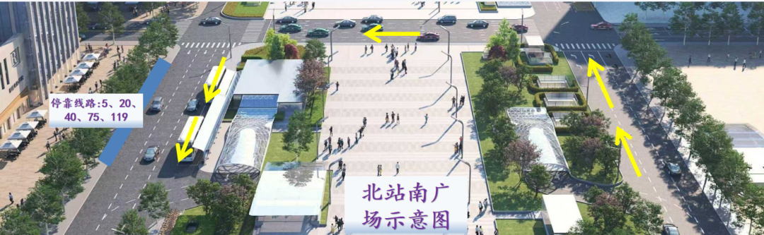 将原途经市庄路北站的公交5路、20路、40路、75路、119路迁入北站南广场运行,行径市庄路运行北站东街、市庄北路、北站西街、市庄路返回。