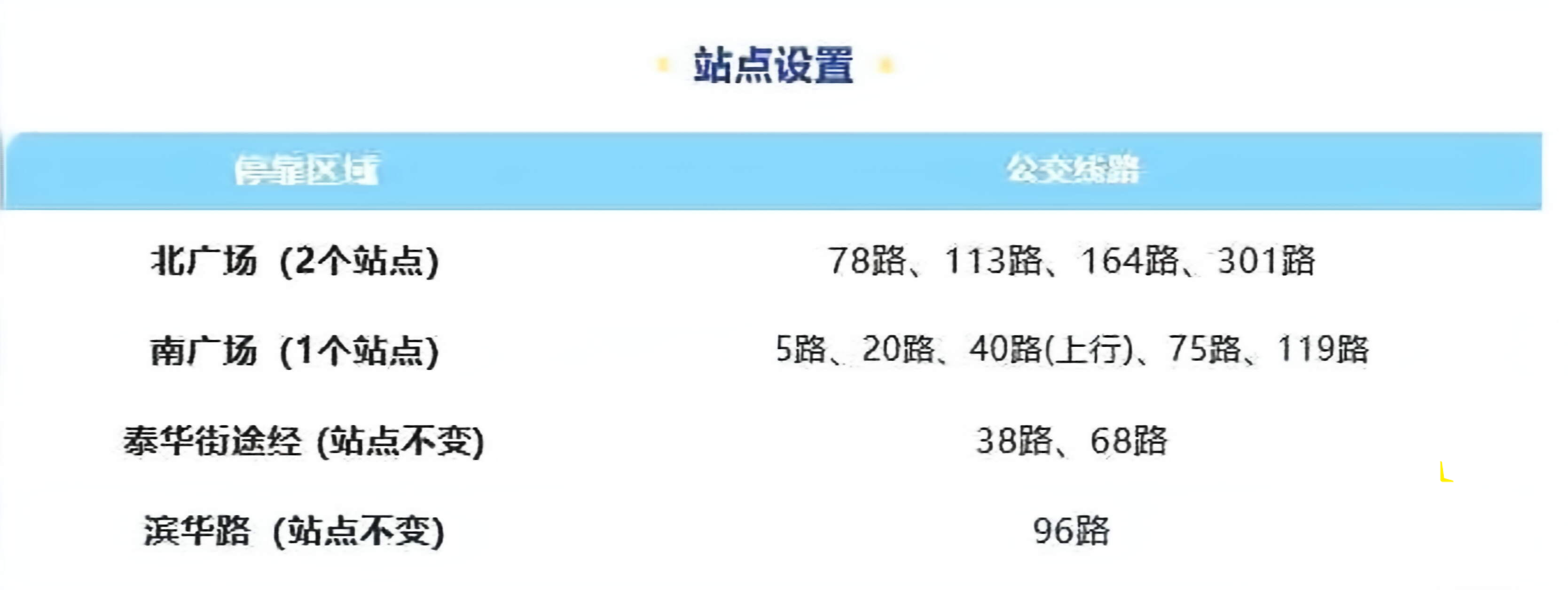 北广场:北广场站点位于滨华路南侧,共有两个站台,其中1号站台停靠线路为113路、164路;2号站台停靠线路为78路、301路。