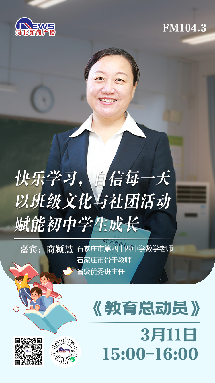 初中阶段,学业压力增大、青春期心理变化、人际交往困惑,不少孩子会在学习中感到疲惫、焦虑,甚至失去自信。如何让孩子快乐学习、充满自信,今天邀请长期扎根初中一线、既有数学学科教学经验,又深耕班级管理、学生成长指导的优秀班主任,她是来自石家庄市第四十四中学数学老师、石家庄市骨干教师、省级优秀班主任商颖慧老师分享,她是如何用班级文化建设、学生社团活动,真正点燃学生内驱力的。作为家长的我们,又可以做些什么,帮助孩子增加内驱力?