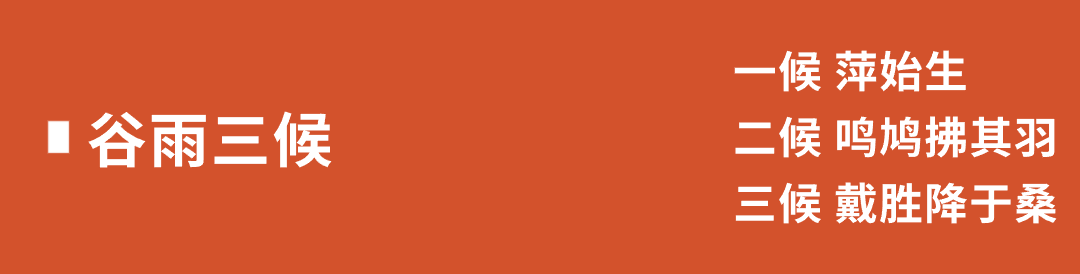 谷雨是春天的最后一个节气,它与小满、小雪、大雪一样,都是反映降水现象的节气,也都是古代农耕文化对于节令的反映。谷雨节气将“谷”和“雨“联系起来,蕴涵着“雨生百谷”之意,它也是唯一将物候、时令与稼穑农事紧密对应的一个节气。此时正是田中秧苗初插,耕耘播种的时候,最需要雨水的滋润,谷得雨而茂盛。谷雨时节,随着降水量的增多,草木葱茏,春意更深。