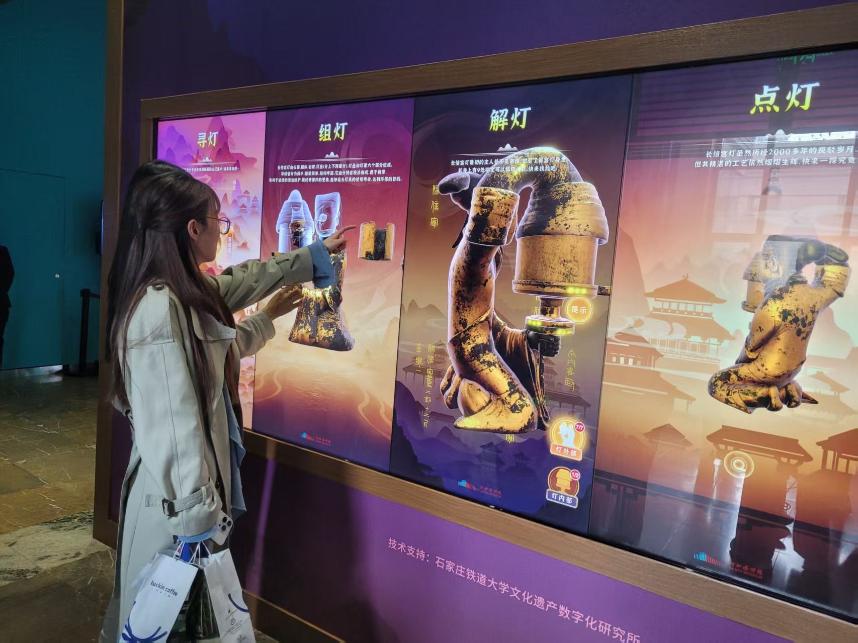 除了这些可以带回家的文创,河北博物院还借助数字技术,让文物真正“活”了起来。在“长信宫灯”互动区,一位小男孩正专注地在触控屏上滑动手指。他从虚拟的土层中一层层“挖掘”,当长信宫灯的轮廓完整浮现、灯盏亮起的那一瞬间,小男孩开心地笑了起来。旁边的VR体验区,则让观众能以更直观的方式与千年文物“零距离”对话。河北博物院数字资源部高级工程师贾丽娜指着VR设备介绍说:“这款VR头盔采用轻量化设计,包含汉代安车部件拼装,可乘坐自己拼装的安车出游打猎,猎物是由院藏文物动物器型幻化出的‘器灵’,体验的过程中深入了解文物的历史文化。”