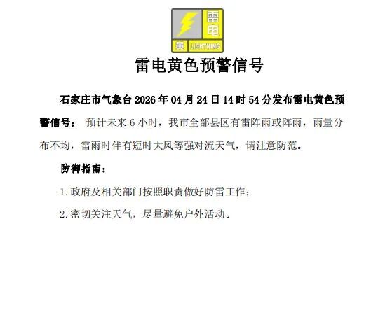 石家庄市气象台2026年4月24日14时54分发布雷电黄色预警信号: