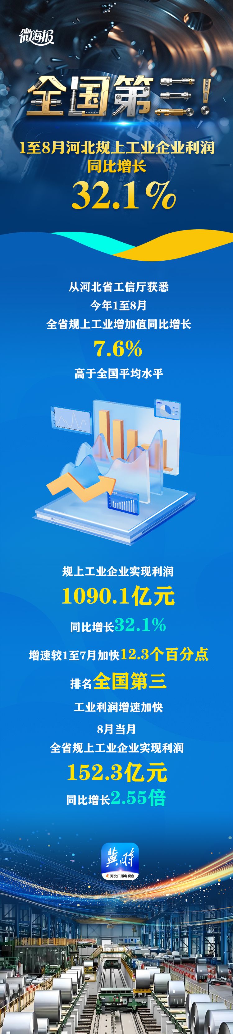 微海报丨全国第三!1至8月河北规上工业企业利润同比增长32.1%