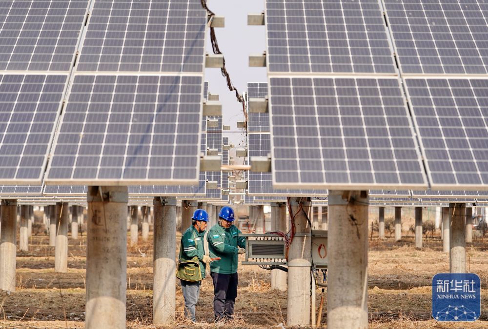 ↑ 1月16日,国网巨鹿县供电公司的工人在辖区阎疃镇附近的“农光互补”光伏发电场巡检并网线路。