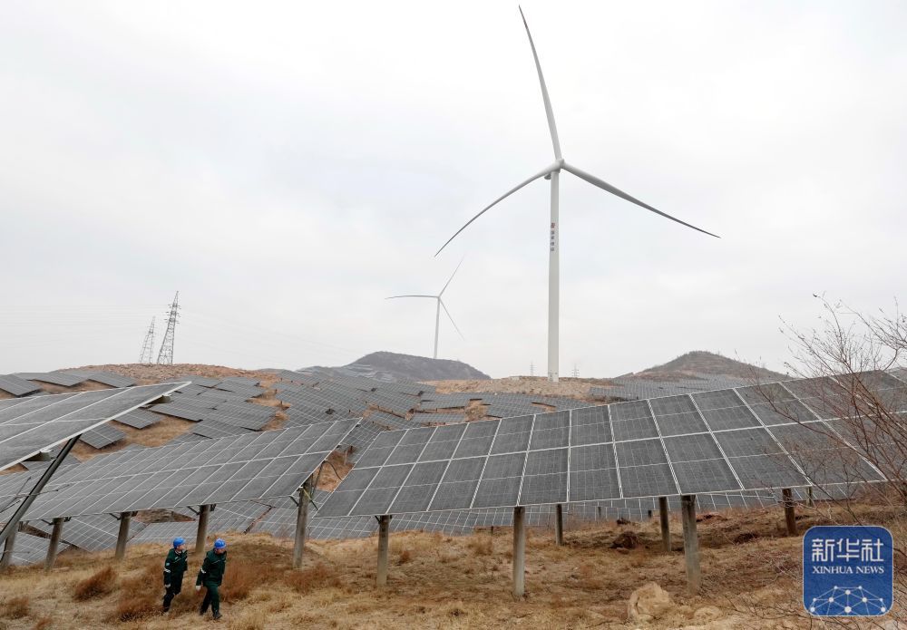 ↑ 1月17日拍摄的河北省赞皇县院头镇曹家庄村附近的“风光互补”发电场(无人机照片)。