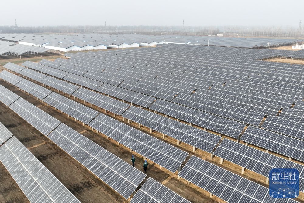↑ 1月16日,国网巨鹿县供电公司的工人在辖区阎疃镇附近的“农光互补”光伏发电场巡检并网线路(无人机照片)。