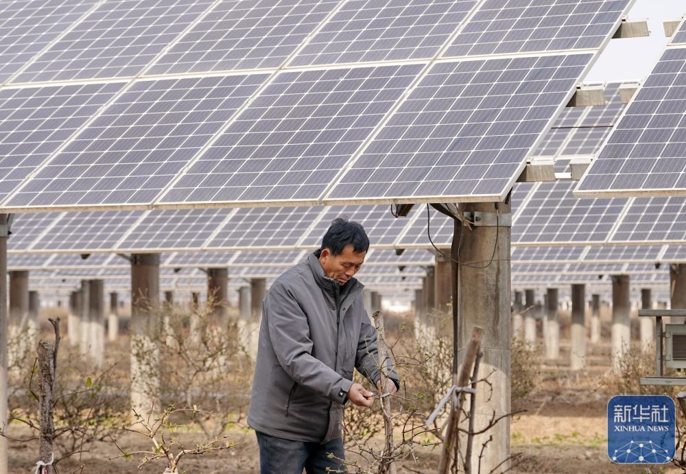 ↑ 1月16日,河北省巨鹿县阎疃镇的一名农民在“农光互补”光伏板下管护金银花苗。
