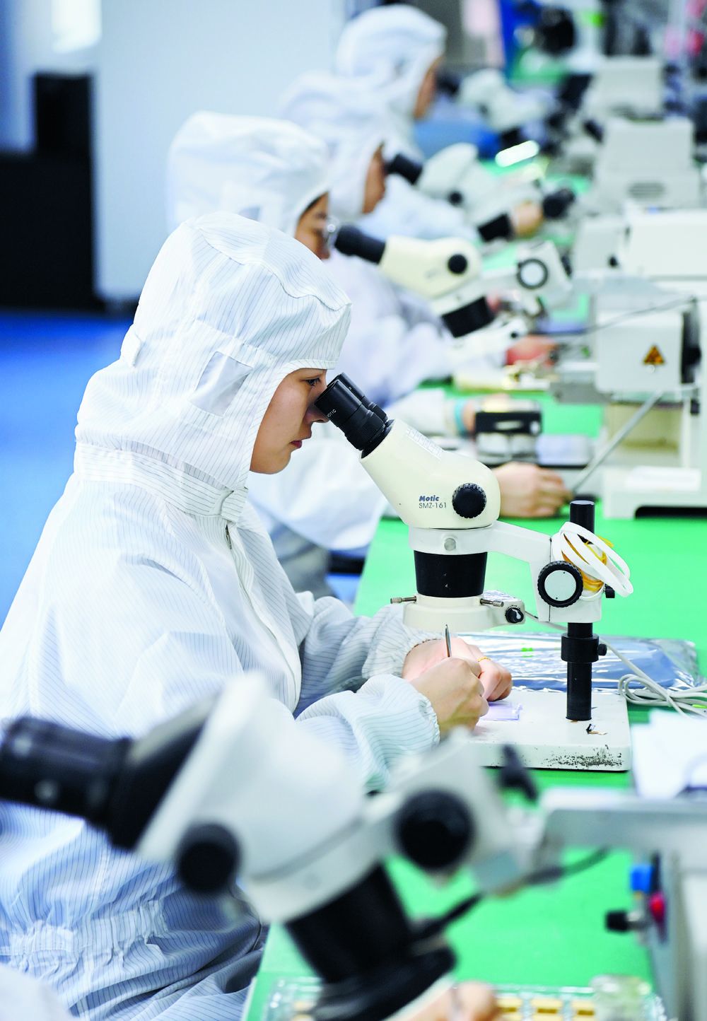在河北东森电子科技有限公司微组装车间,工作人员正在对功率模块进行MCM微封装生产。