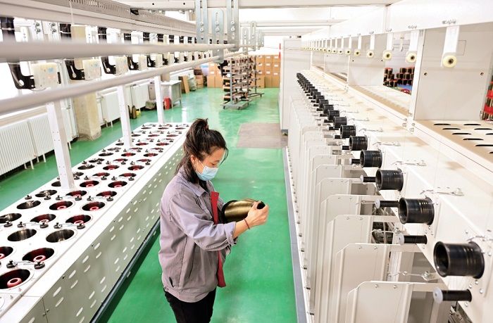 承德中纤科技有限公司生产线上工人们正仔细检查玄武岩纤维丝。